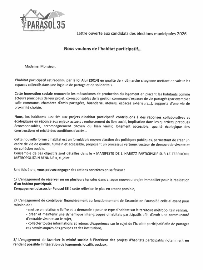 Nous vous remercions pour votre manifeste et pour votre engagement en faveur de l’habitat participatif à Rennes et en Ille-et-Vilaine.