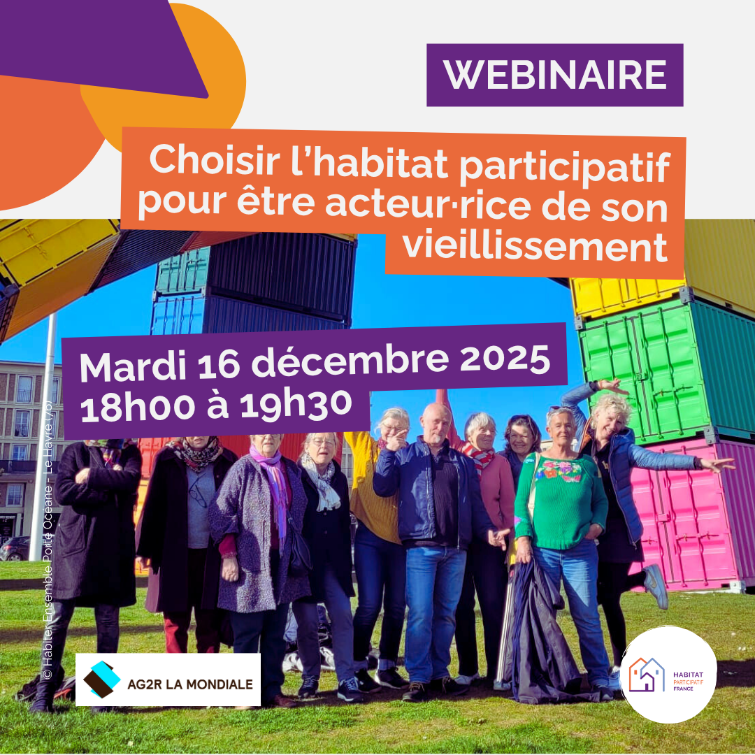 Dans le cadre du programme « Habitat Participatif et seniors » financé par AG2R LA MONDIALE, ce dernier webinaire de l’année 2025 donnera la parole à des personnes qui ont choisi de se lancer dans un projet d’habitat participatif pour être acteur·rice de leur vieillissement.